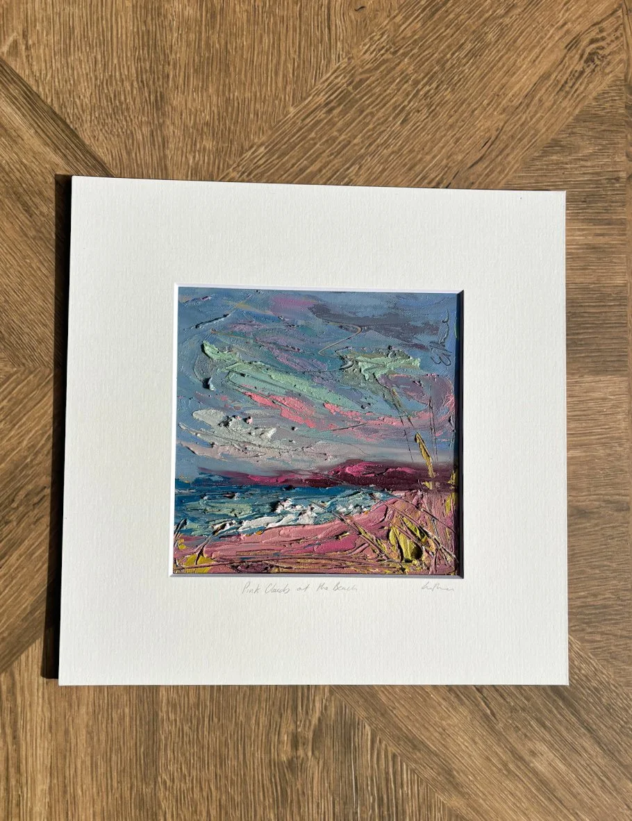 Shop › Pink Clouds at the Beach Image 1 of 2 Image 2 of 2 Pink Clouds at the Beach £115.00 Oil paint on paper. Arrives mounted, ready for framing.25.5 cm x 25.cm mount. 14.5 cm x 14.5 cm artwork. Add To Cart Added! Oil paint on paper. Arrives mounted, ready for framing.25.5 cm x 25.cm mount. 14.5 cm x 14.5 cm artwork.